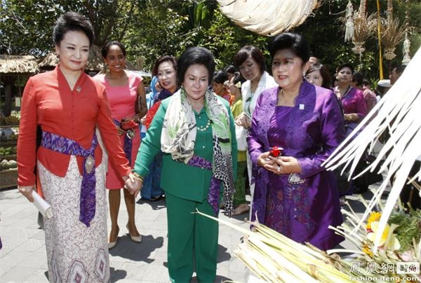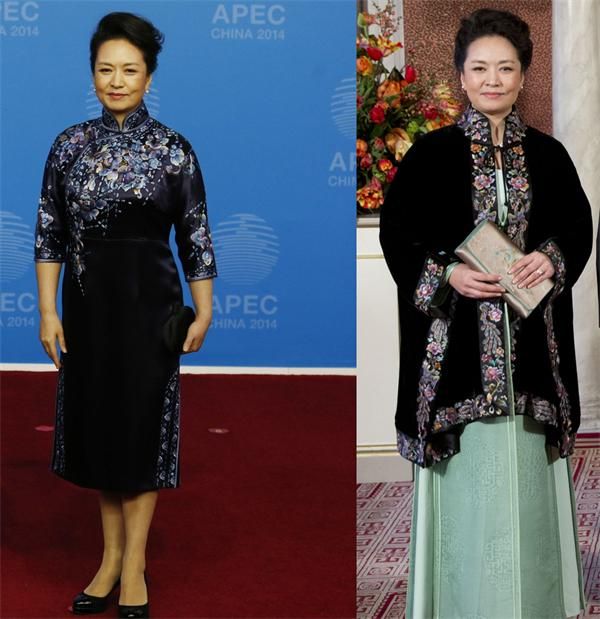 彭丽媛出席2014APEC非正式会议欢迎晚宴(左),彭丽媛穿传统中式罩衫(右).