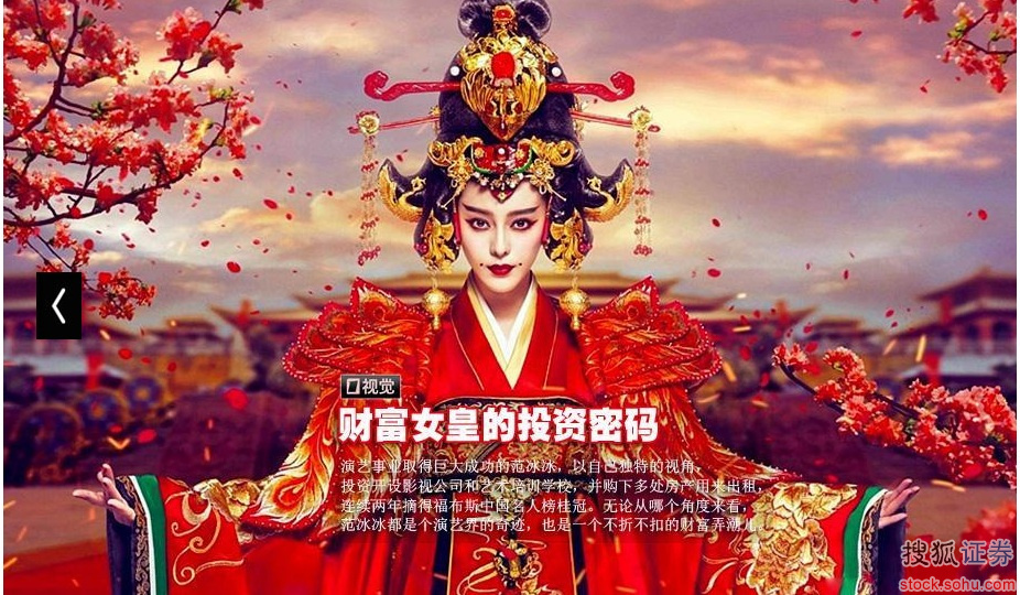 范冰冰善于打理片酬、代言等收入。单纯片酬方面,1996年拍《还珠格格》时,范冰冰的片酬才30万元,如今更是动辄数百万元。除了丰厚的片酬,她还以高价接下路易威登等多家全球知名品牌的形象代言。