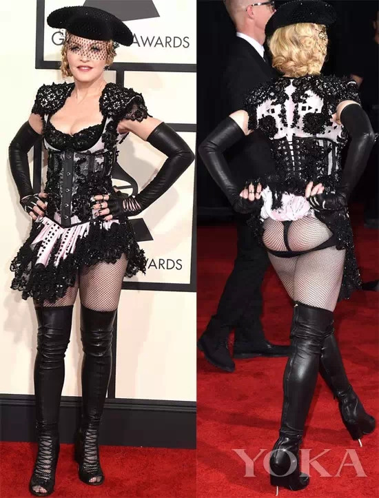 第57届格莱美颁奖礼在美国洛杉矶斯台普斯中心举行,今年的格莱美红毯堪称是史上最无底线,除了霉霉中规中矩的蓝色渐变长裙,其他唱将各自都突破以往造型。麦当娜蕾丝紧身裙最无底线,整身大腰封蕾丝裙大有女仆加SM合体的味道,娜在红毯上还肆无忌惮的撩起裙摆,媒体齐齐把镜头对准了两坨“蟠桃”臀……