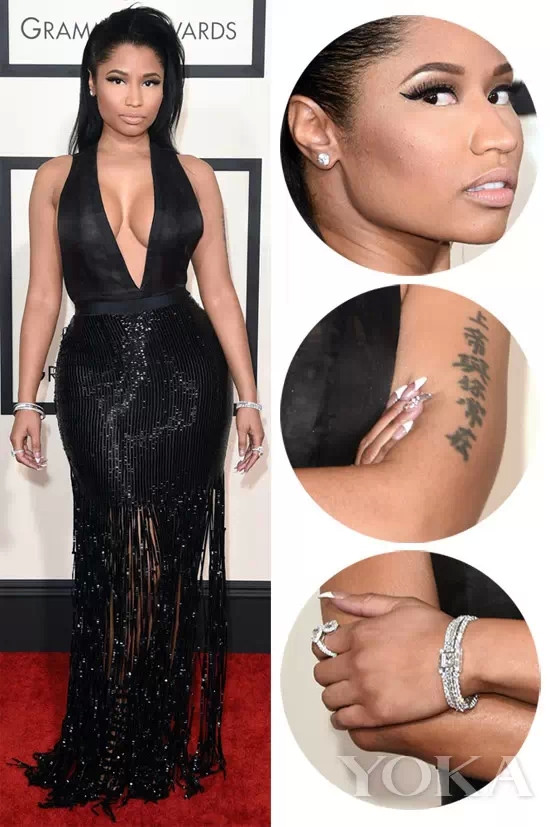 Nicki Minaj身穿Tom Ford黑色长裙,这酷炫拽的杀马特发型把裙装衬出了80年代的水晶窗帘的感觉。