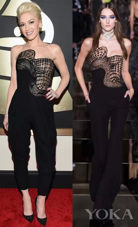 Gwen Stefani身穿Atelier Versace 2015春夏黑色抹胸裤装