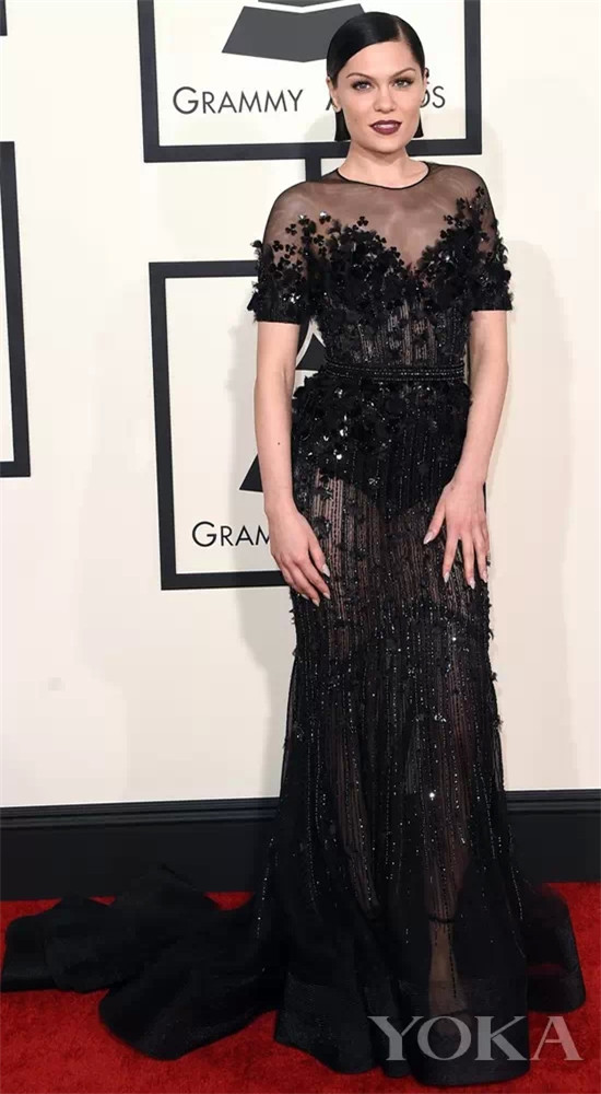 Jessie J黑色蕾丝裙若隐若现,浓烈唇妆性感——