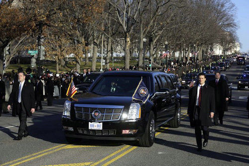 1月21日,在美国首都华盛顿,奥巴马在华盛顿国会大厦宣誓就任第57届美国总统。至此,总统专属座驾——凯迪拉克“陆军一号”,也再度迎来了奥巴马成为新一届为期四年的主人。在总统就职典礼结束后,“陆军一号”载着奥巴马从国会大厦出发,沿宾夕法尼亚大道游行至白宫,吸引了超过8800名游行参与者。