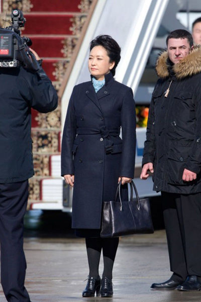 彭丽媛身着深蓝色双排扣风衣,简约而典雅的外套在丝巾的点缀下端庄优雅,简约的外套设计在丝巾和腰带的系法、外套的长度、鞋子和手袋的搭配上展现精致的服饰细节,无不体现中国特有的典雅与大气。