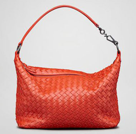 BV家族2011年的新款的包包,它的价格也不像Cabat系列那般昂贵,属于白领女性能够接受的消费层次。同样的编织款式让手袋表面保留了皮革的天然色泽,并突出皮质本身美感。而艳丽的颜色更是BV家族的一大特色,相信会有不少低调优雅的OL一族选择。Bottega Veneta品牌手袋以软包为主,编织皮革被处理的极为柔软,完全不用担心磨损衣服。除了单纯的编织纹理外,有的手袋还打上镂空的金属铆钉、或预先在局部位置打了结、在纵横格子加了车缝线装饰,甚至还有故意在每个格子切了一道口子,用久了就会翘起来,原来是呼应隐喻吉祥富贵的金鱼,其设计理念十分有趣。