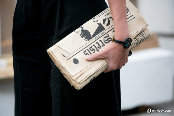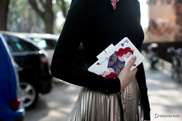 蛋糕式的手拿包、琴键式的手包,又或是个性几何排列成的手袋,扑克牌款的手包。。。米兰街头的型人们将独具匠心的元素,或是时尚流行的元素玩转得十分热闹。造型各异的装扮与单品,仿佛将Cosplay玩转得乐趣无穷。