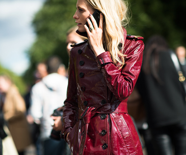 英国名媛Poppy Delevingne在巴黎街头随性地诠释大红色漆皮风衣