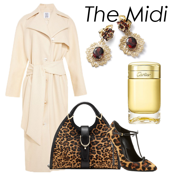 Rosie Assoulin风衣;Dolce & Gabbana耳环;Cartier香水;Gucci手拎包;Gucci高跟鞋