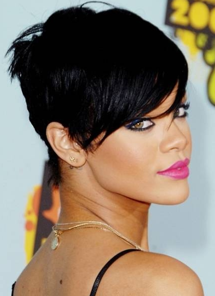 蕾哈娜 (Rihanna)的这款发型还是很经典的。她的具有层次感的刘海让她的额头不至于显得太大。