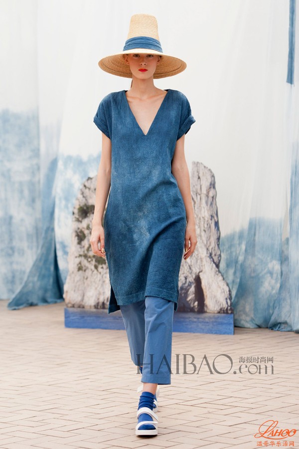 因为由染色棉线和漂白面料交织而成,因此钱布雷布 (Chambray) 呈现出一种淡淡的古旧感蓝色,被称作钱布雷蓝 (Chambray blue) ,也就是上图所示的那种淡蓝色。但随着纺染技术的进步,钱布雷布也和丹宁布一样,拥有越来越多的色彩,但基本还是以蓝色为主,只是因为供应商和染布批次不同,呈现出不一样的深深浅浅的蓝色。今天海报编编给大家推荐的钱布雷布T台时装,也由多种蓝色面料制作而成。