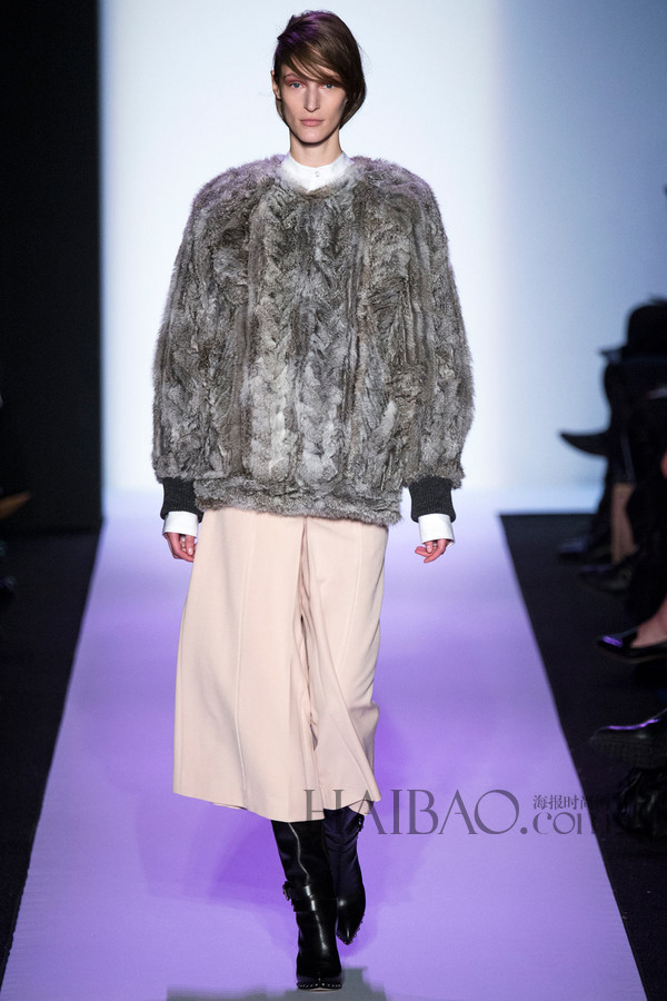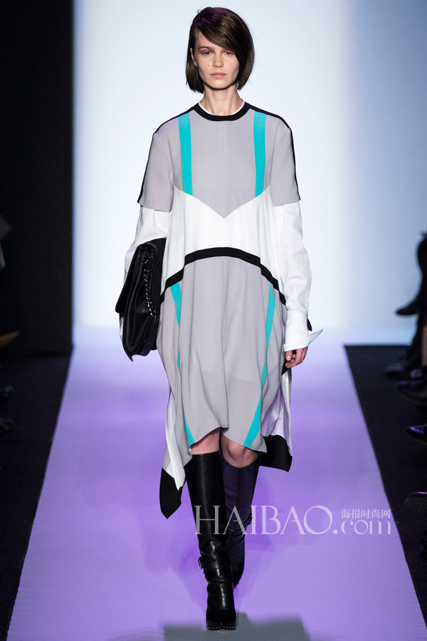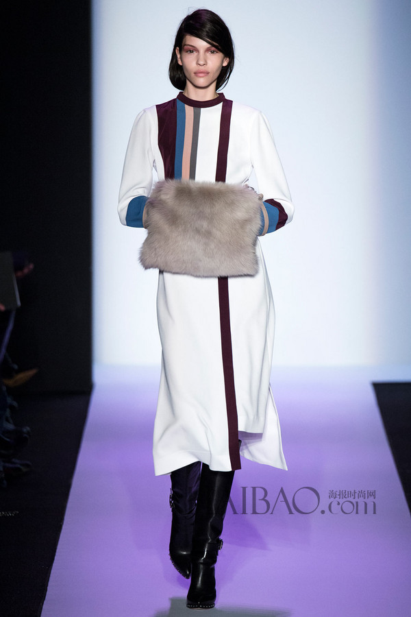 这一季,设计师将重点集中在中长度上,从开衩及不规则的中裙到宽松的裙裤款式,设计师一律采用了刚刚过膝盖的裙长设计,搭配上未过膝盖的长筒皮靴,颇有七十年代的时髦风范。而条纹和色彩始终是贯穿整场时装秀的主旋律,我们可以看到色彩鲜艳的条纹不断地出现在整场秀中,既具有复古气息又有着现代的几何美感。而设计师使用压纹技术在面料上呈现的类似西服条纹的线条艺术也是本季的一大亮点,除此以外,毛料与皮革以及布料这样的不同材质拼接成的条纹也为整体带来了更丰富的层次感。