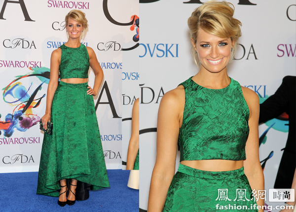 Caroline这身绿色分段式长裙其实并没有将她的高挑身材显示的很完美,反而让手臂和腰部看起来非常壮硕。但是小麦美肌和礼服的颜色非常贴合,整套Look清爽优雅。