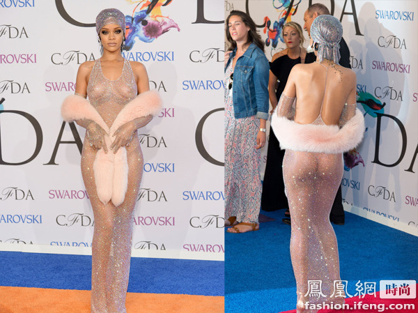 No Bra风潮的引领者蕾哈娜此次获得CFDA年度偶像大奖,这个在时尚圈不一般的奖项,蕾哈娜也用不一般的造型来领奖。这次蕾哈娜又大玩No Bra风潮,这样的举动我们在2月的巴黎时装周就见识过,但是这次蕾哈娜只穿了一条裸色的丁字内裤,整个臀部全裸暴露在外,用白色的皮草遮挡隐私部位,一身Adam Selman水晶裙搭配水晶头巾以及魅惑烟熏妆,整个像是刚出浴的“盖茨比”名伶,网友直呼:蕾哈娜简直了!