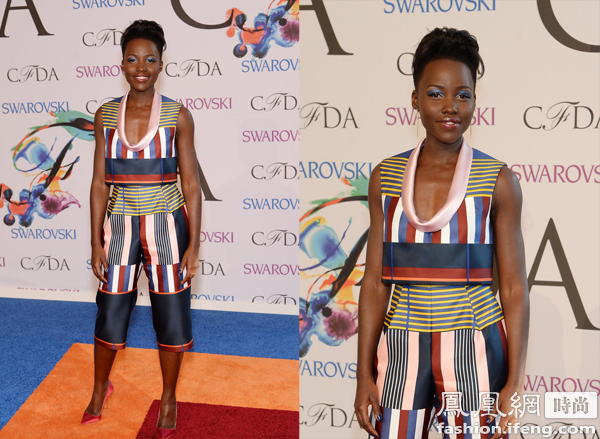 在5月的大都会博物馆红毯上发挥失常的时尚新Icon露皮塔尼永奥在此次的CFDA上挽回颜面,集合线条和亮色系混搭的裤装清爽迷人,闪光面料非常符合她光洁的肌肤,深V的圆形领口设计拉长颈部比例,又不失优雅。