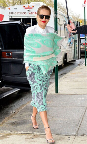 Rita OraRita Ora身披薄荷绿印花围巾搭配白色衬衣,脚踩银灰色凉鞋,时尚气质无人能敌。