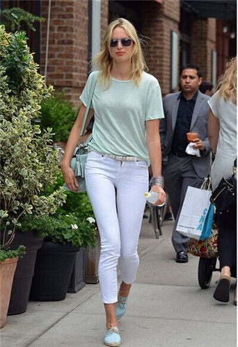 Karolina Kurkova身穿薄荷绿短上衣下装搭配白色九分裤,清新气质扑面而来。