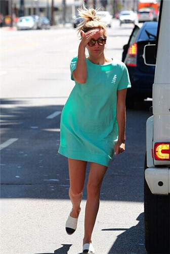 Elle fanning一身薄荷绿宽松连衣裙现身街头,一头飘逸的金色长发顿时让整个搭配仙气十足。