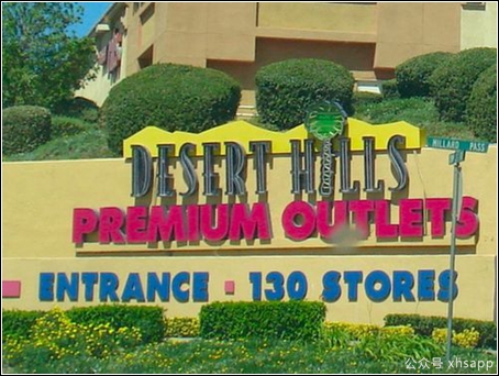 第一印象:Desert Hills Premium Outlets位于加州的棕榈泉,从洛杉矶市区驱车沿10号公路而行,大约需要两个半小时,路上能看到美国西部的沙漠风景。虽然路途显得有些遥远,但花一天时间来这里依然非常值得,对于那些没有太多时间去一家一家在市区精品店内购物的人来说,这里就是一站式的购物天堂。占地广大的Desert Hills Premium Outlets共有130多家品牌店铺,是与纽约附近的Woodbury Premium Outlet齐名的美国最大规模的Outlets,也是美国西南方最大的名牌大卖场。从Burberry、Gucci、GiorgioArmani General Store 、Prada 、Dior、Dolce & Gabbana等世界一线品牌,到Gap、Levis、Timberland等日常消费级品牌,在这里都可以找到。
