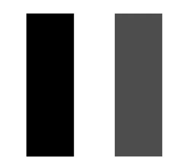 同等面积的两个矩形,由于色彩明度不同,便会给人面积不等的心理感受。左边的黑色,会看起来比右边的灰色面积略小。
