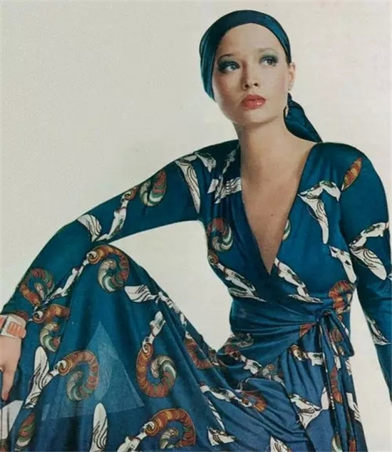 1972年,模特穿着黛安·冯芙丝汀宝 (Dianevon Furstenberg) V领印花长款裹身裙(Wrap Dress) ,被称赞“这条裹身裙包裹住了圆润的身材,充满了诱惑力。”