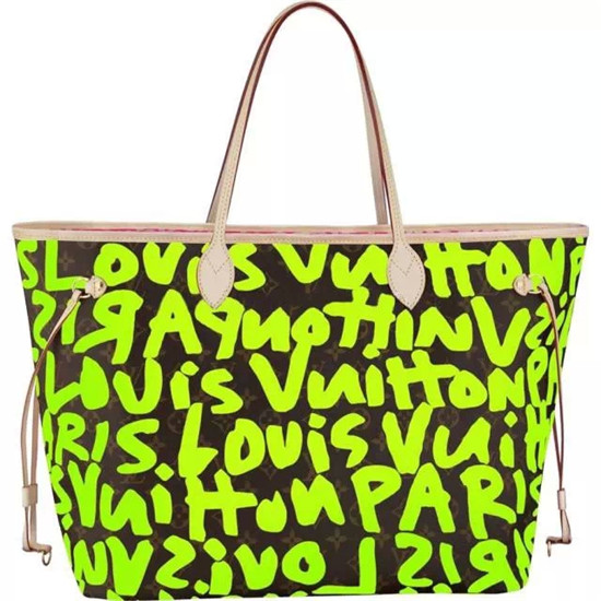 这款Neverfull包依旧被Stephen Sprouse创造性的用上了荧光色的涂鸦,包内巨大的空间必须要归功于两边的带子,黄铜色的拷边与内置的小口袋再次印证了Neverfull无所不能的实用性。