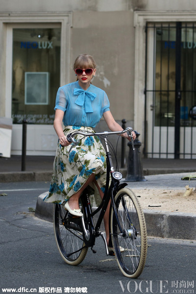 泰勒-斯威夫特为新歌拍摄MV,身穿蓝衫花裙的她戴着红色边框墨镜骑着Brooklyn Bicycle Co.自行车,十足复古风情。