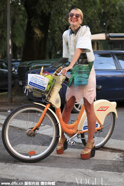 时装顾问Natalie Joos米色 拼接衬衫和不规则流苏短裙配上造型搞怪的彩色墨镜,当然一定少不了夏季时尚单品-单车。