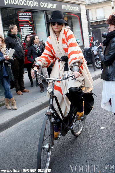 时装顾问Natalie Joos钟爱波点的情结不难从自行车上看出来,彩框复古墨镜也是十分上镜。