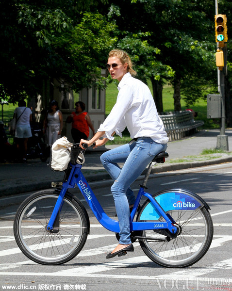 卡莉-克劳斯骑着城市自行车去健身房。白色衬衫和仔裤的搭配依旧经典