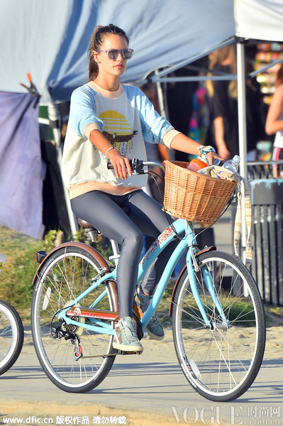 妮娜-阿格戴尔骑单车出门。蓝色墨镜+蓝色棉Tee造型清爽又运动。
