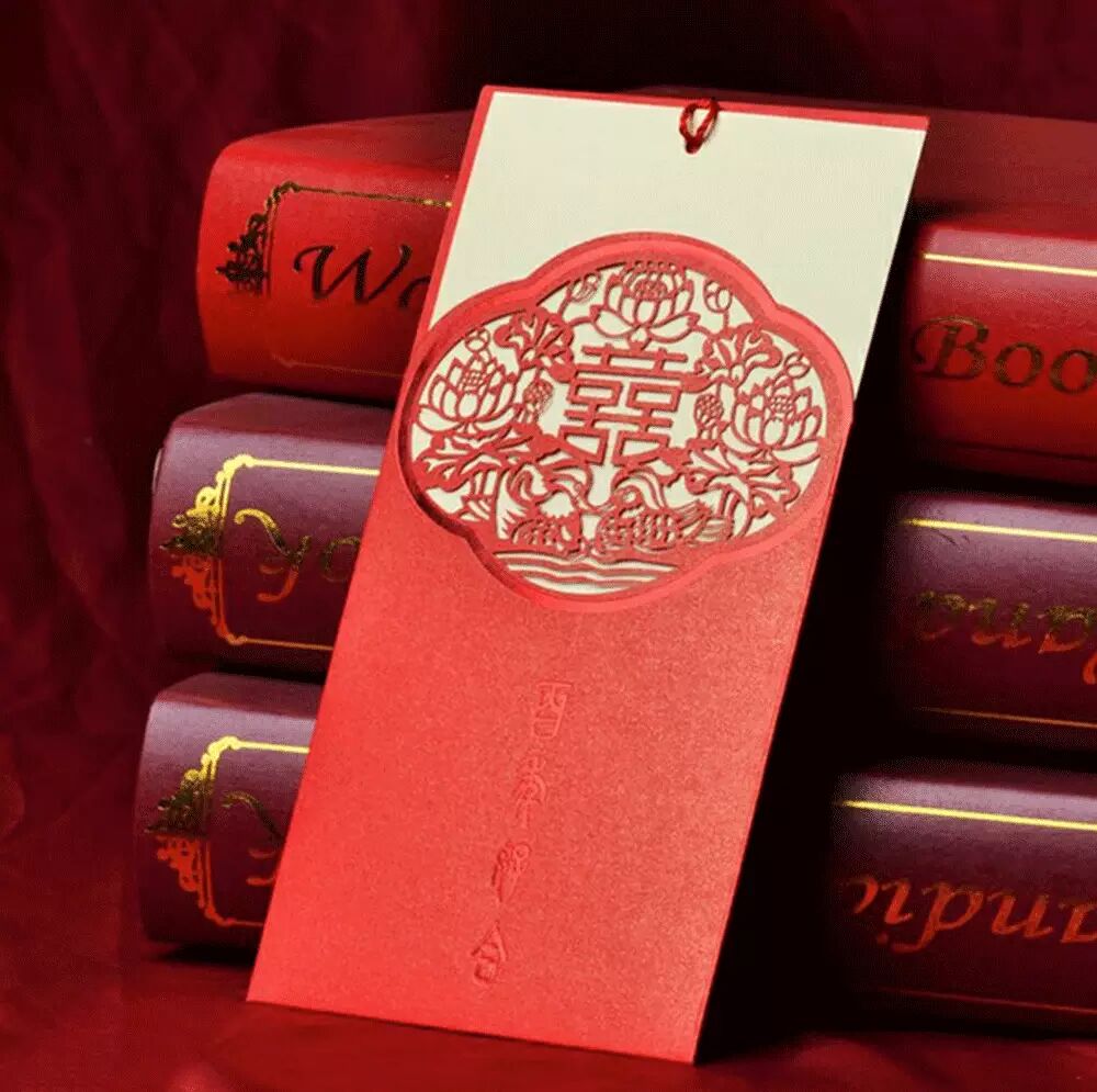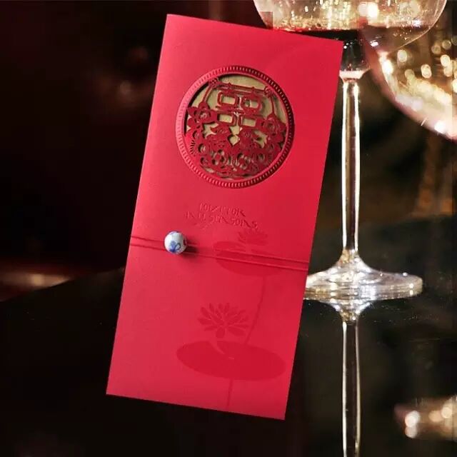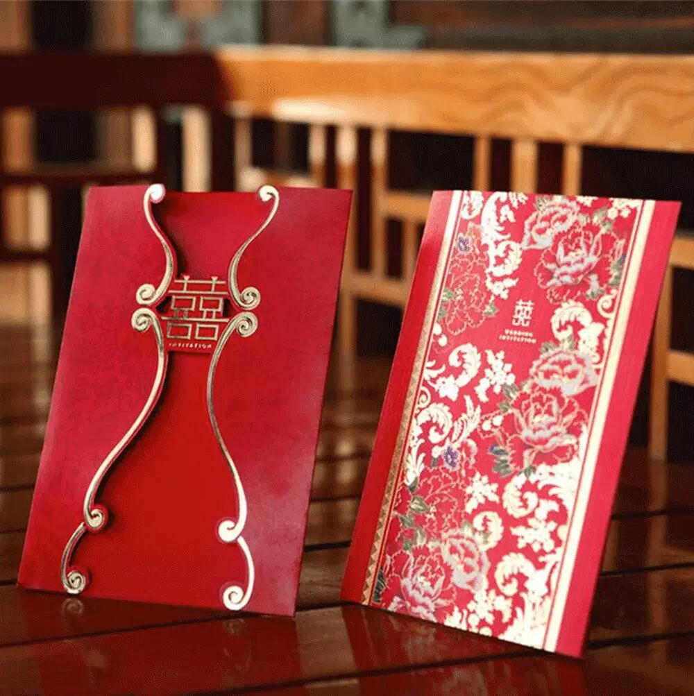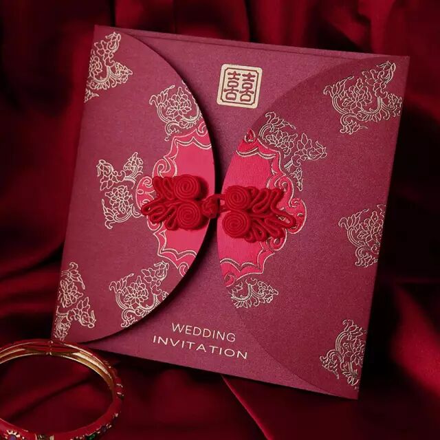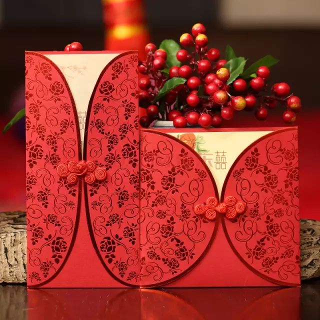 中国风请柬多以红色为基础色调,常以喜庆的龙凤纹等纹饰、佐以剪纸镂空、盘扣等传统中国工艺点缀,美丽而大方。