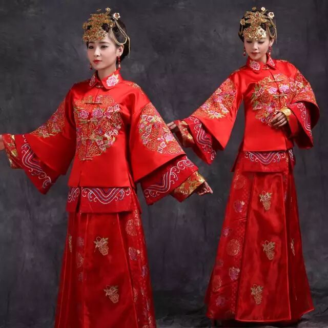 新郎一般穿状元袍,新娘披戴凤冠霞帔。凤冠是饰有银质或其他质地的凤凰模型,霞帔则是红色的披肩,一般来说,新娘穿红绸袄裤,绣花鞋,上绣鸳鸯、梅花、莲花等吉祥图案,手捧苹果,寓意幸福平安。