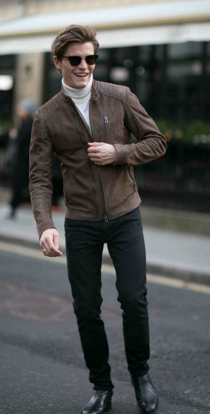 如果你嫌它仍不够商务,可以尝试在高领与西装之间加上一件衬衫,此间风流倜傥、温文儒雅不用赘述。其中的关键在于配色,像时尚博主 Dan Trepanier 这样用白色衬衫配以深灰色西装与同色系高领算是最基本款。配色更大胆一些的话,则可以走混合大地色,驼色大衣、深棕高领、栗色西裤、巧克力色麂皮牛津鞋,这些单品看似不起眼,一旦配上同色系的花纹衬衫就完全不同了。