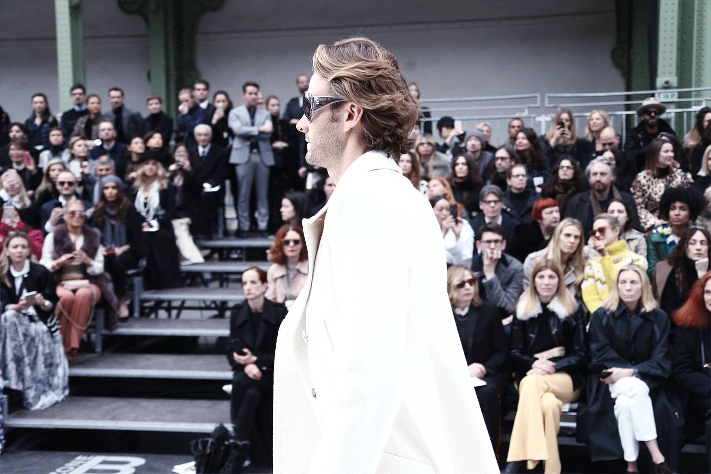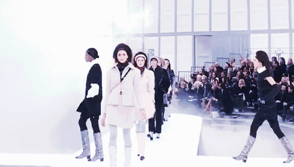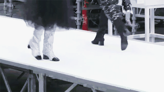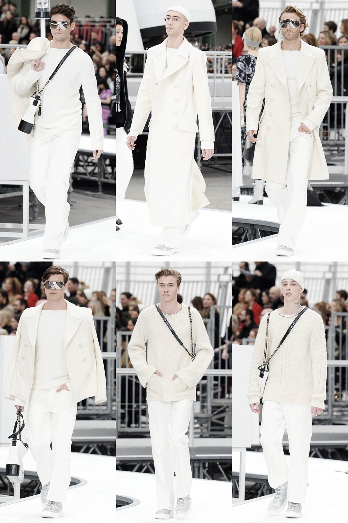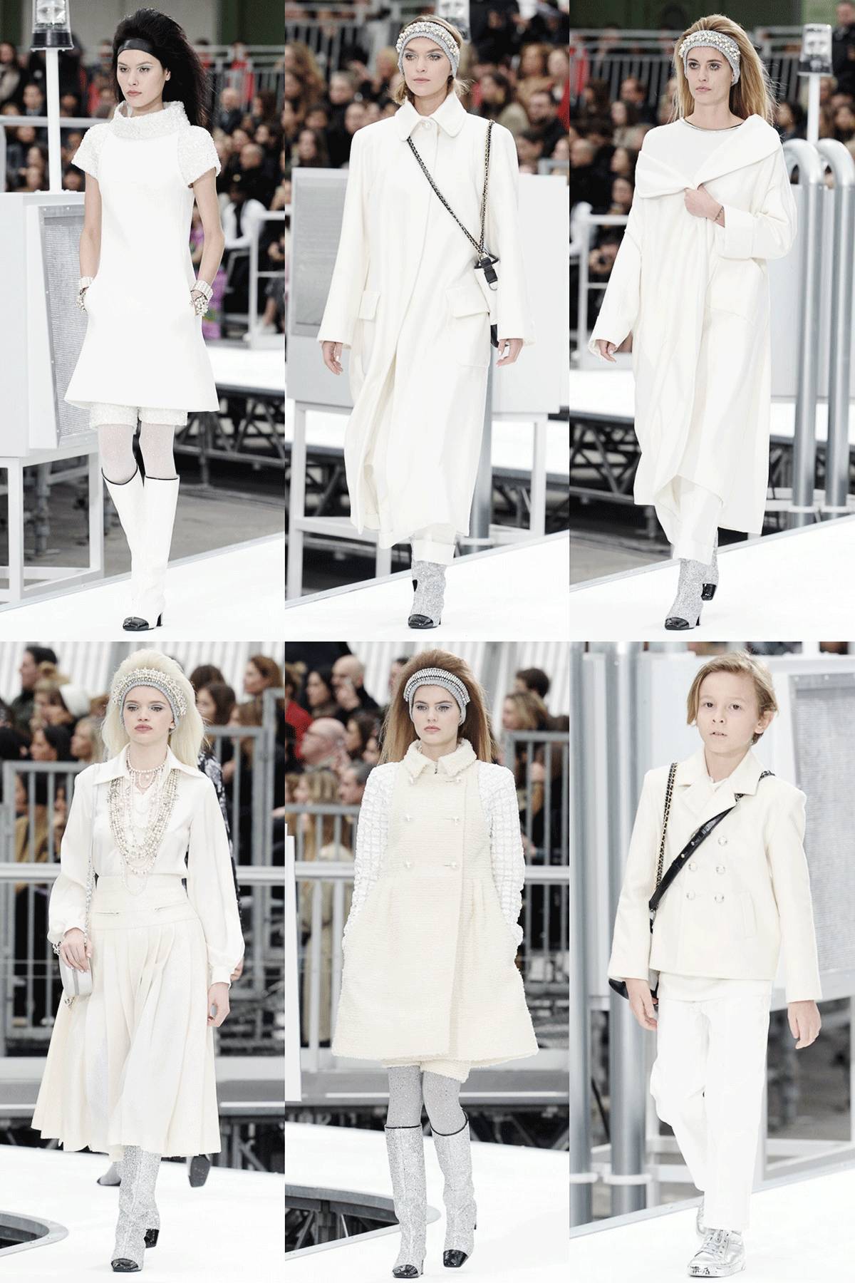 整个系列中12个象牙白造型的一组设计格外抢眼,要知道太空主题之下金属风格反光面料都没有这么强的存在感。其中每季必有的几款男装都安排在了这个环节,老佛爷的教子HK也演绎了一套纯白造型。模特脚上的银色靴子和运动鞋,以及女麻豆的BLING BLING丝袜也呼应了太空主题。