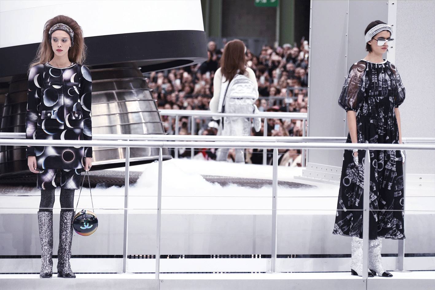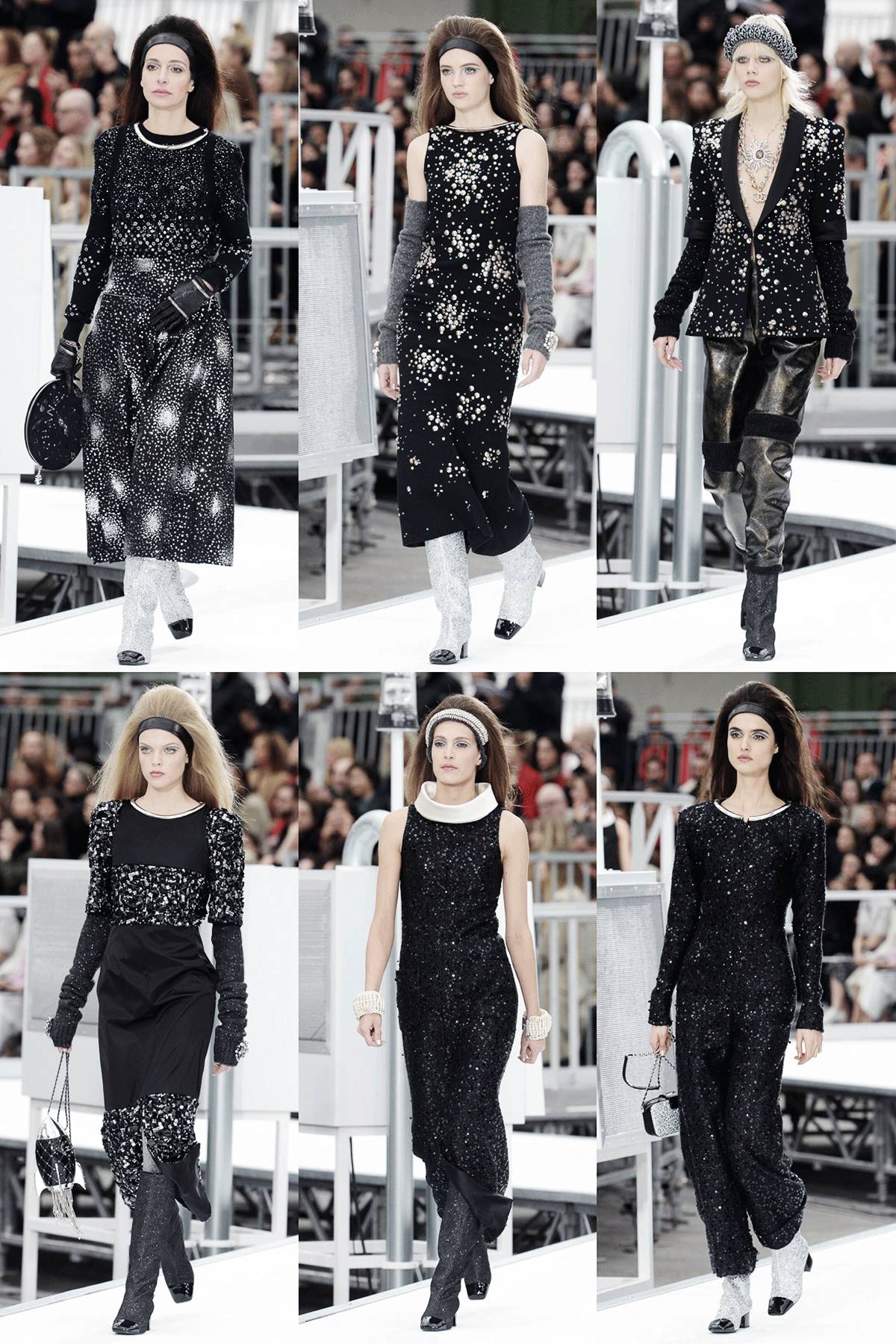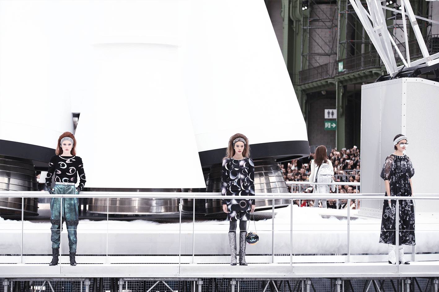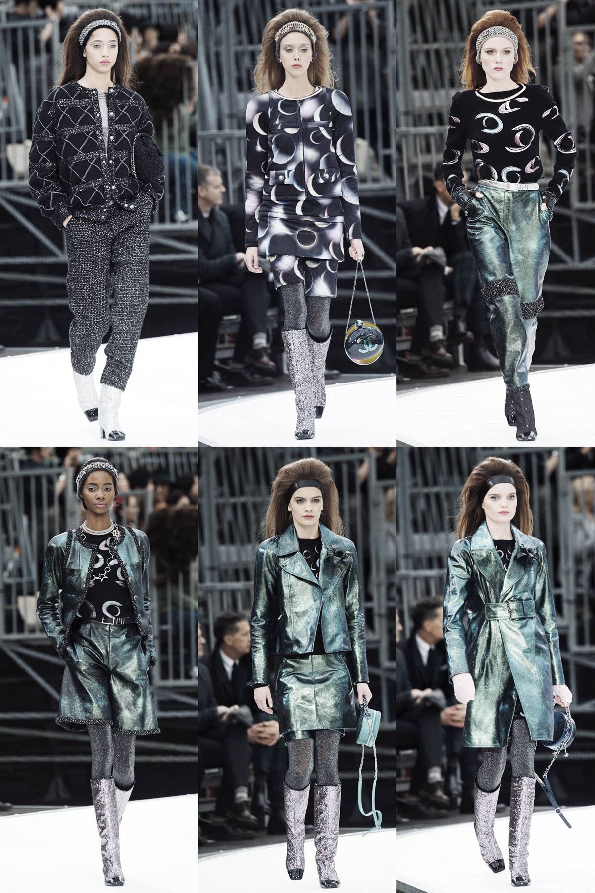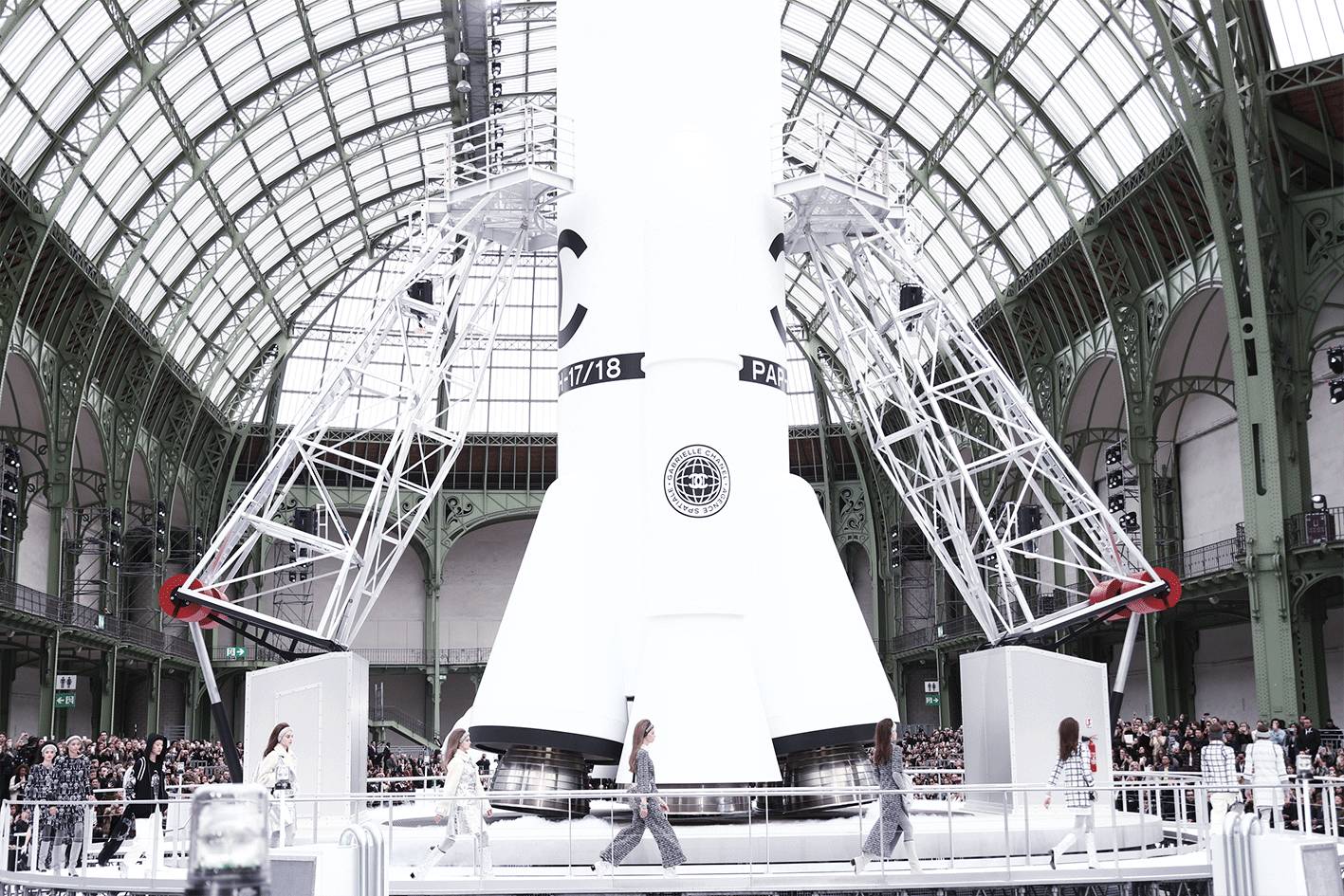 仰望着秀场中央杵着的35高的火箭,就知道老佛爷这一季又到外太空“搜刮”灵感去啦。无论是KARL LAGERFELD还是COCO CHANEL都对天外的那个世界有着美好的想象,CHANEL本人就是一枚星座控,这一季璀璨如星辰的发带正是从星座中汲取的灵感。老佛爷除了迷恋外太空还是货真价实的技术控,2017春夏系列玩的是机器人,2013春夏系列还玩过太阳能。所以这一季文科生与理科生同体,既有星空的诗意浪漫,又有科技的冷静严谨。