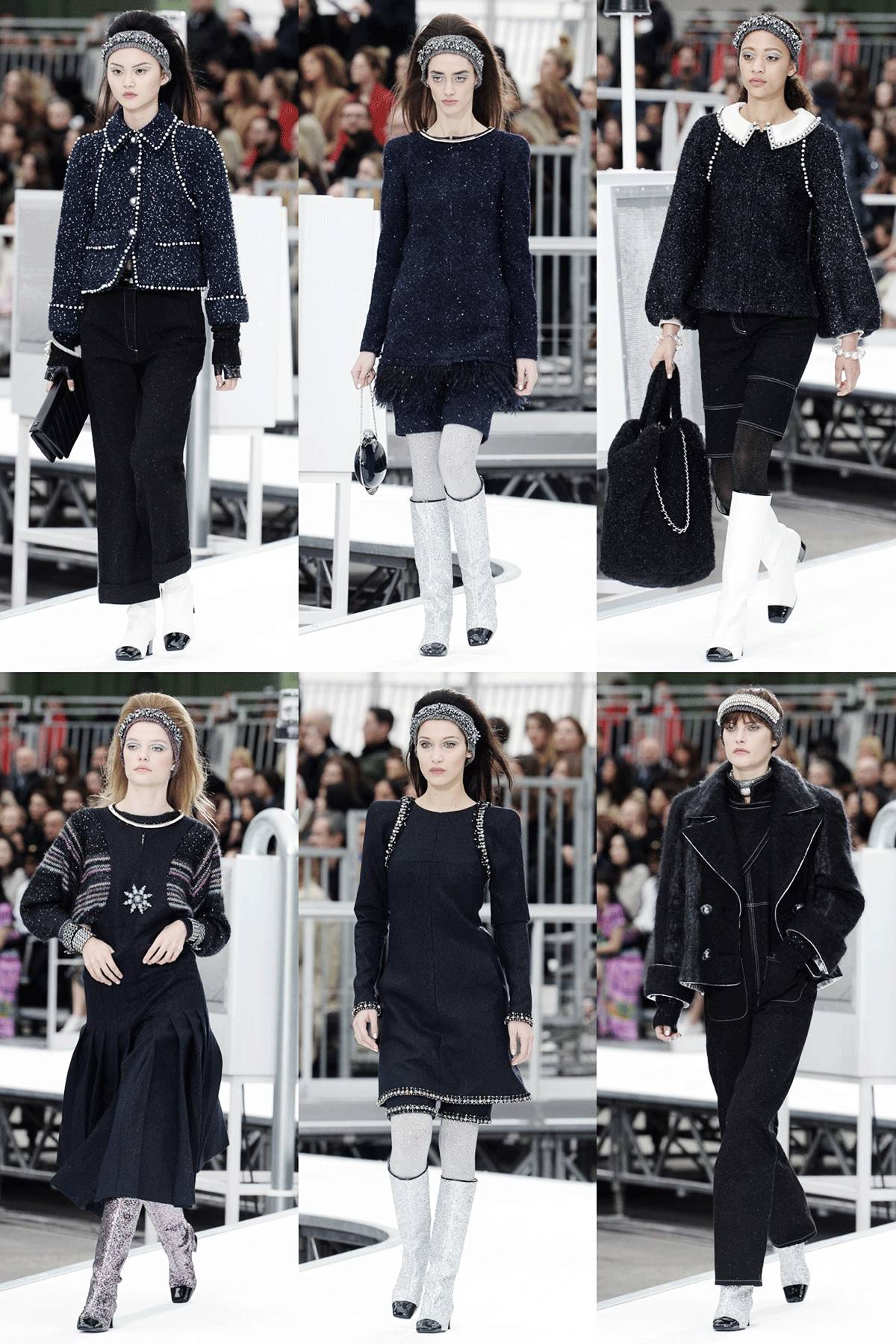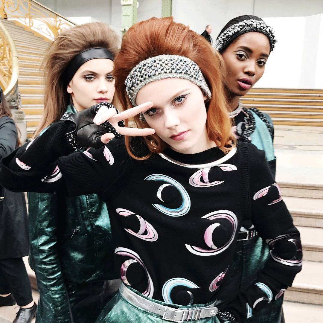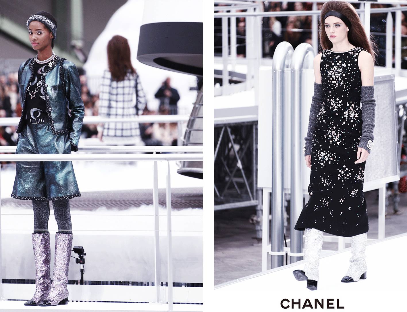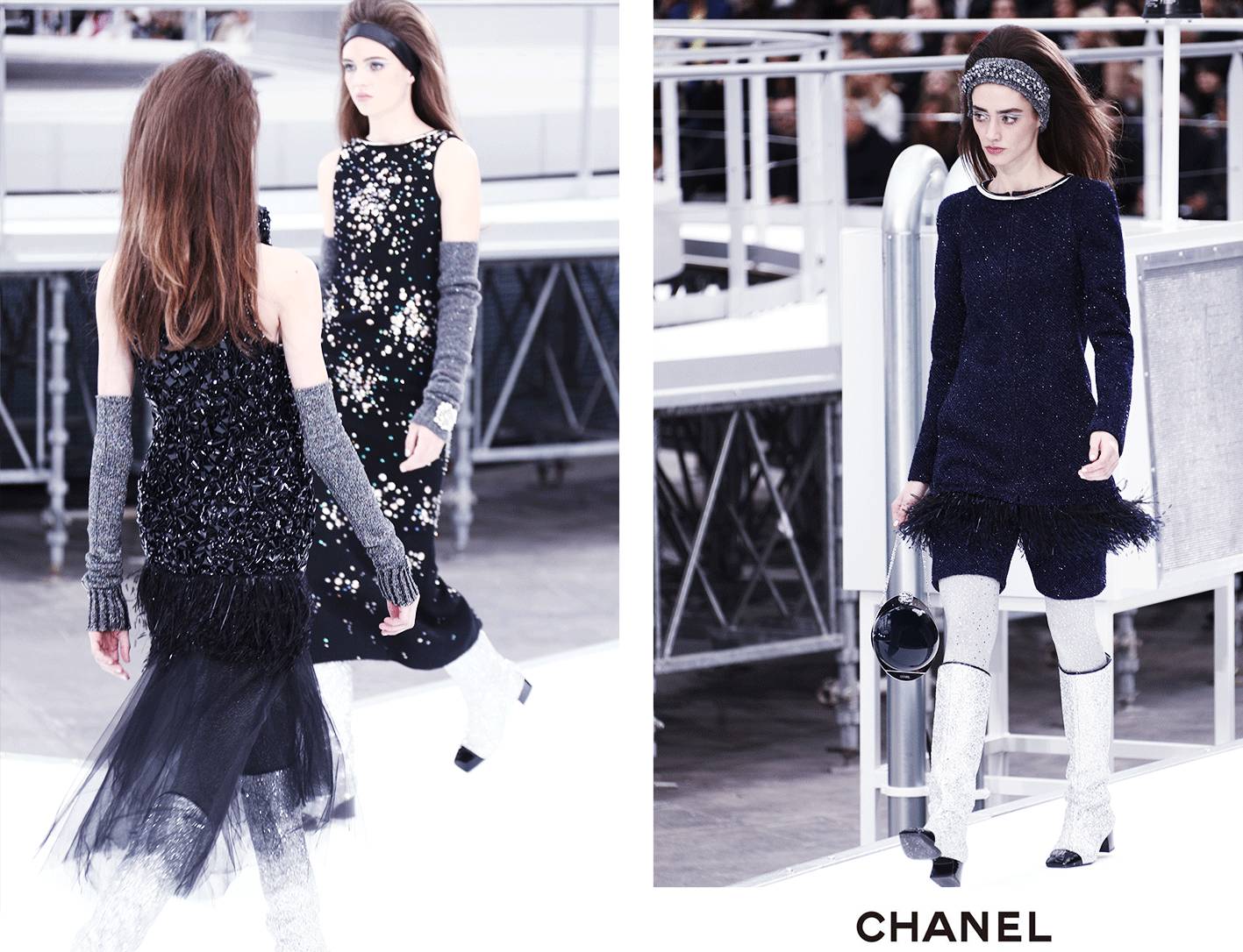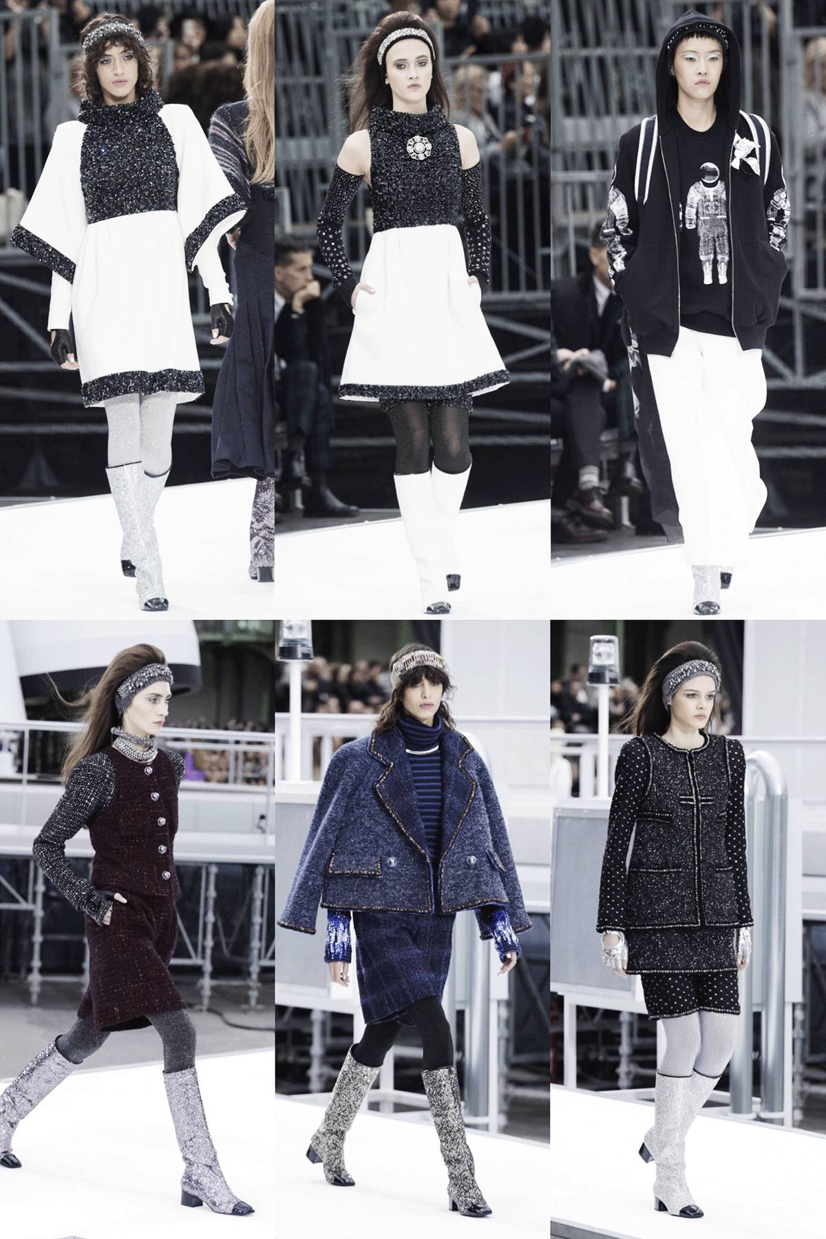 仰望着秀场中央杵着的35高的火箭,就知道老佛爷这一季又到外太空“搜刮”灵感去啦。无论是KARL LAGERFELD还是COCO CHANEL都对天外的那个世界有着美好的想象,CHANEL本人就是一枚星座控,这一季璀璨如星辰的发带正是从星座中汲取的灵感。老佛爷除了迷恋外太空还是货真价实的技术控,2017春夏系列玩的是机器人,2013春夏系列还玩过太阳能。所以这一季文科生与理科生同体,既有星空的诗意浪漫,又有科技的冷静严谨。