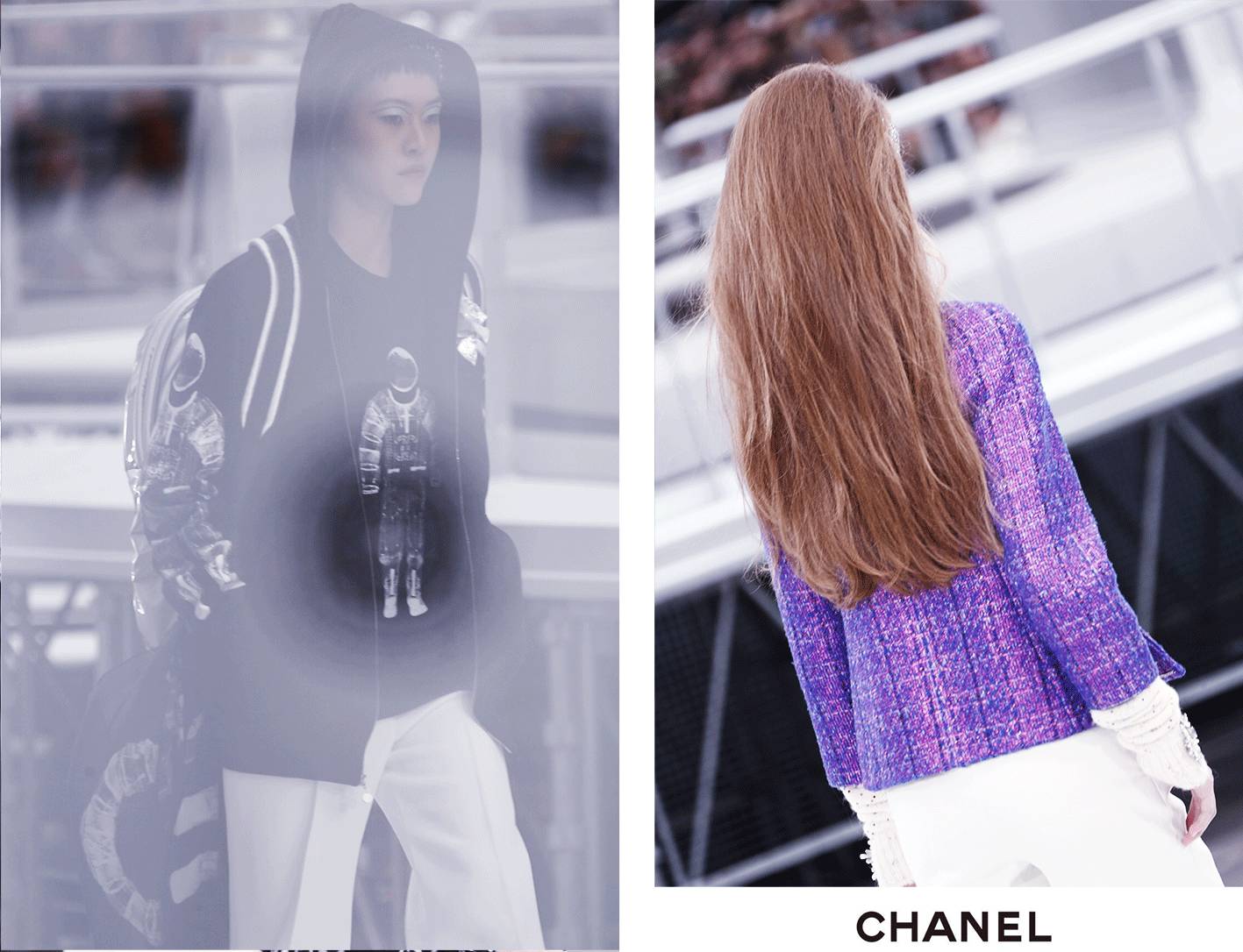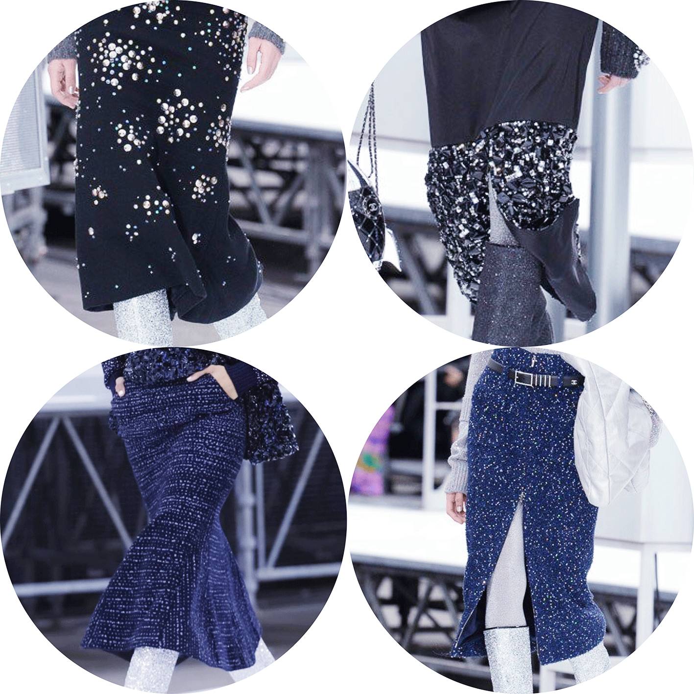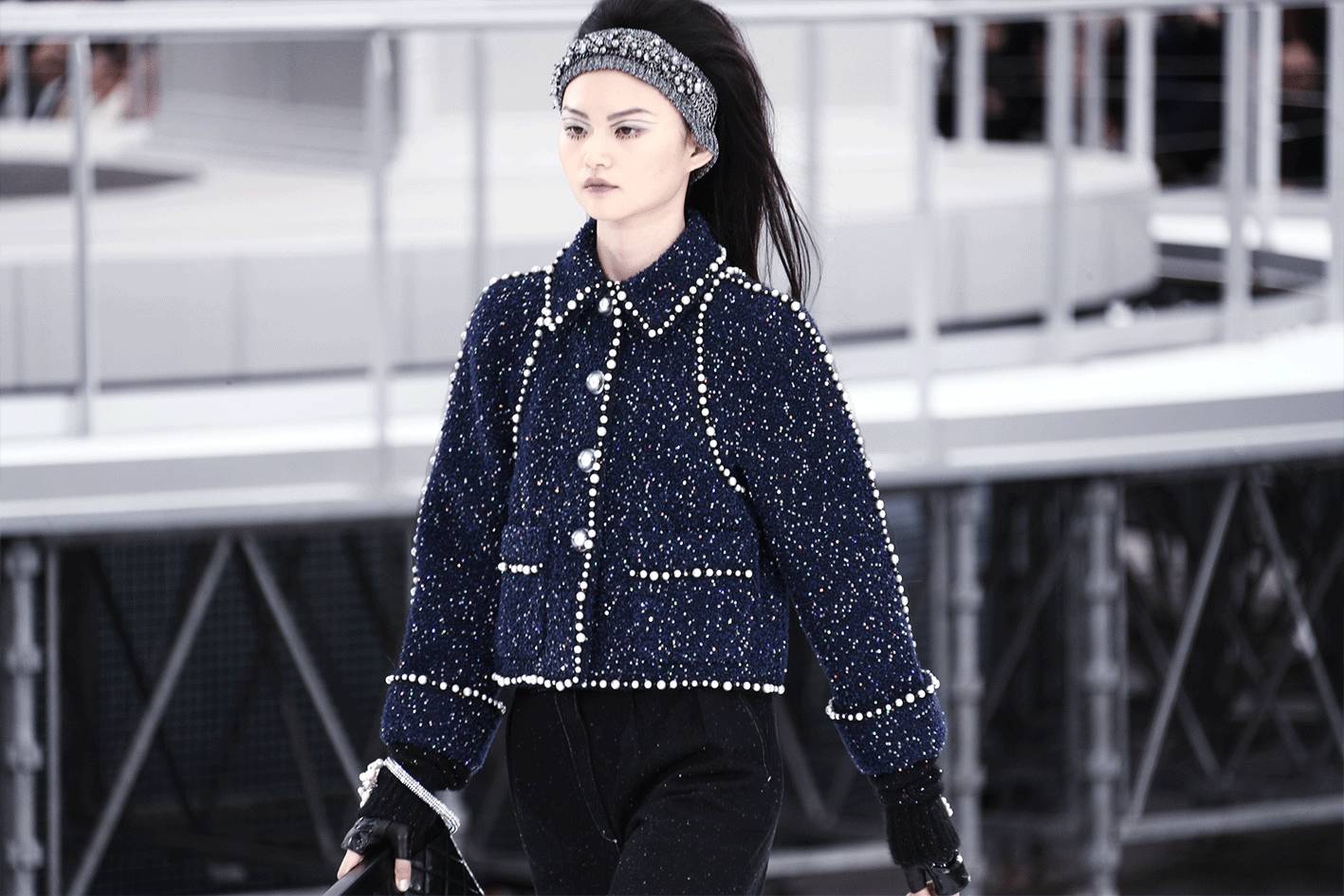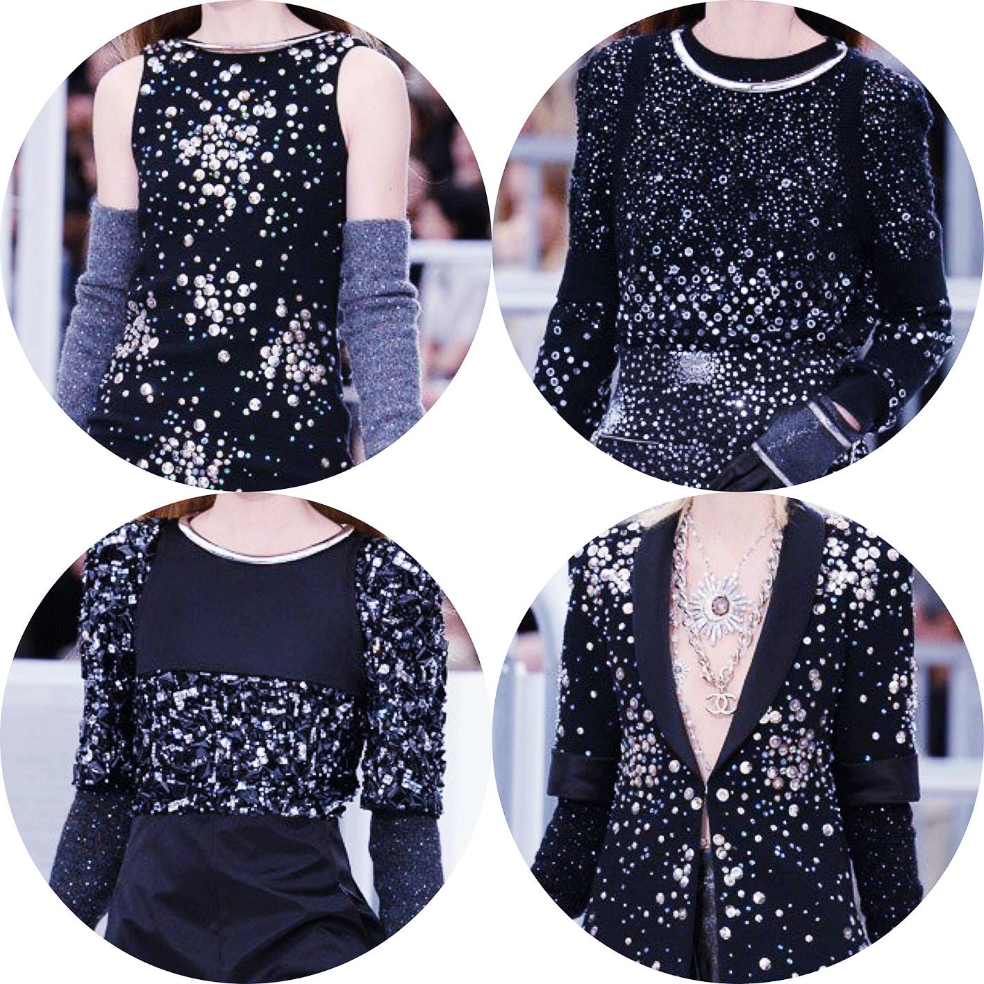 CHANEL经典的斜纹软呢如何“太空化”?答案是把星空搬来!在面料中织入金属丝线,或者用金属丝线刺绣,再或者请水晶、珍珠来帮忙,在柔软的面料之上织出一片璀璨的星空。