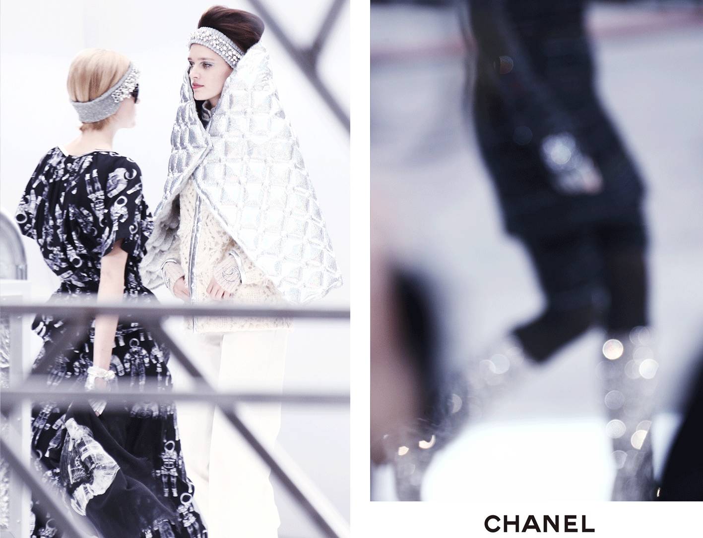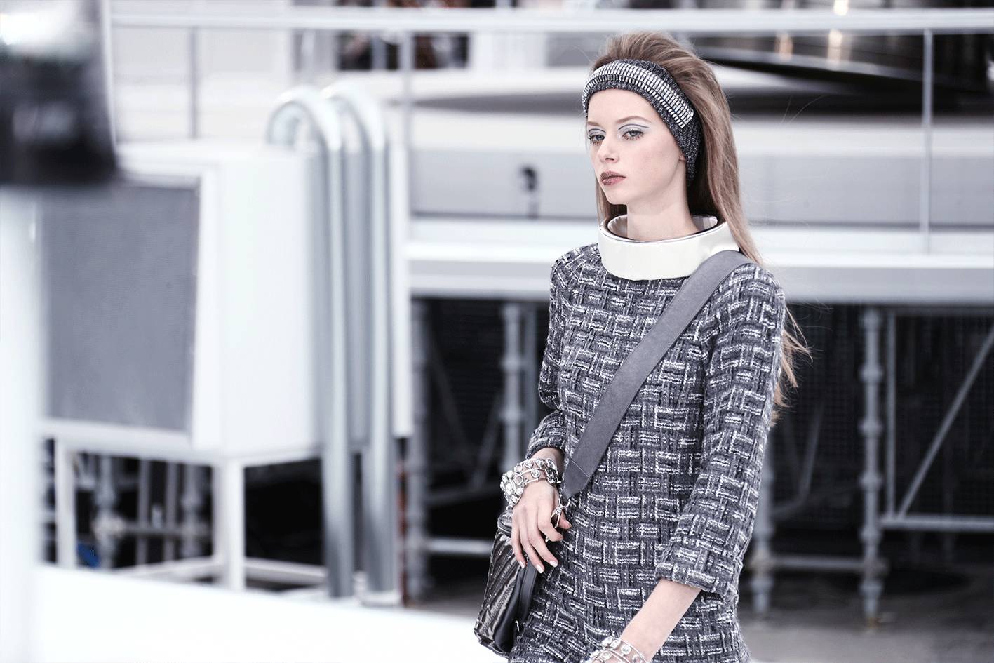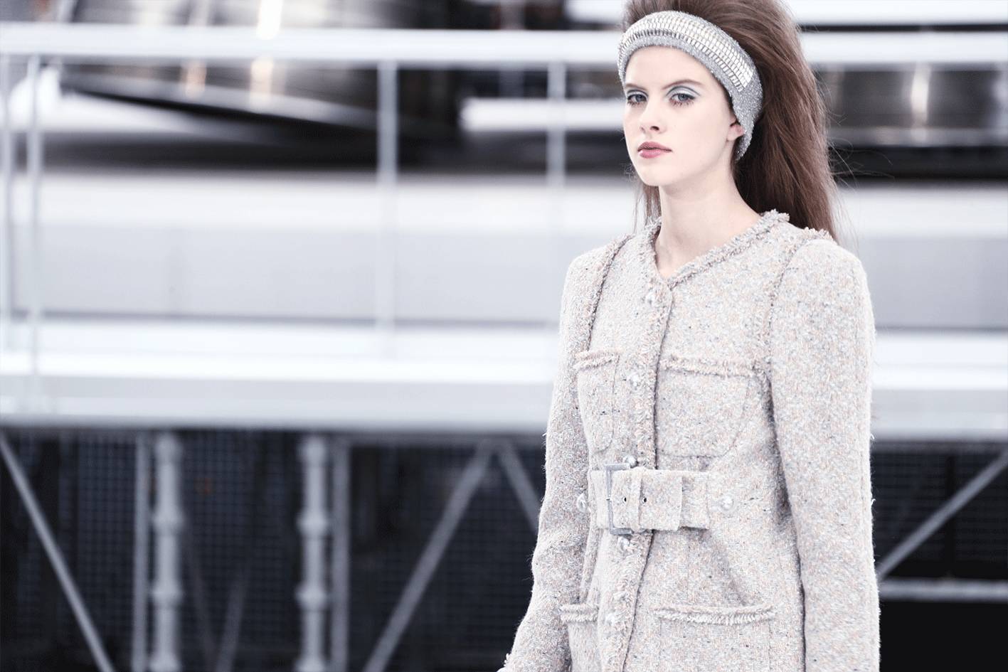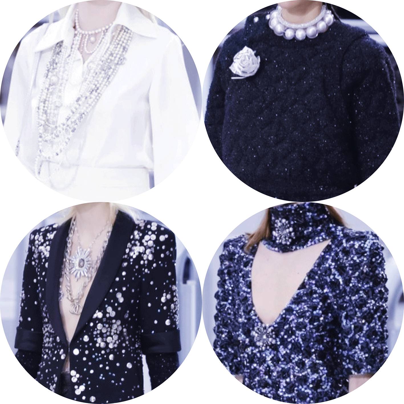 CHANEL经典的斜纹软呢如何“太空化”?答案是把星空搬来!在面料中织入金属丝线,或者用金属丝线刺绣,再或者请水晶、珍珠来帮忙,在柔软的面料之上织出一片璀璨的星空。