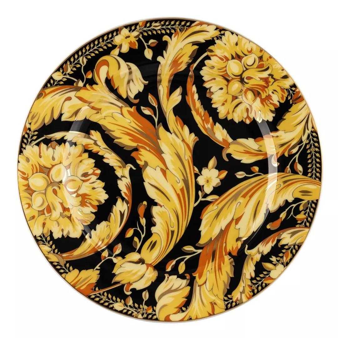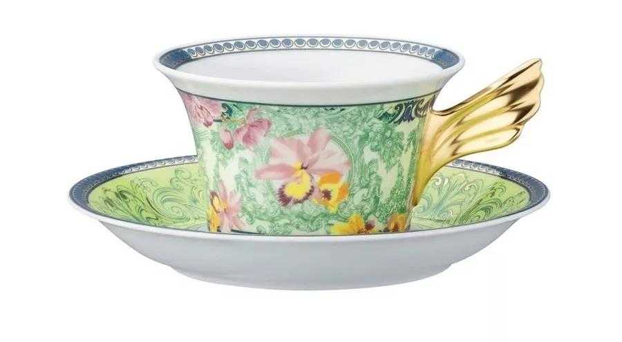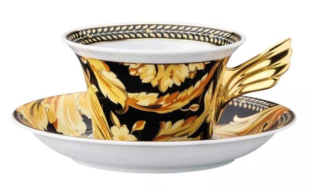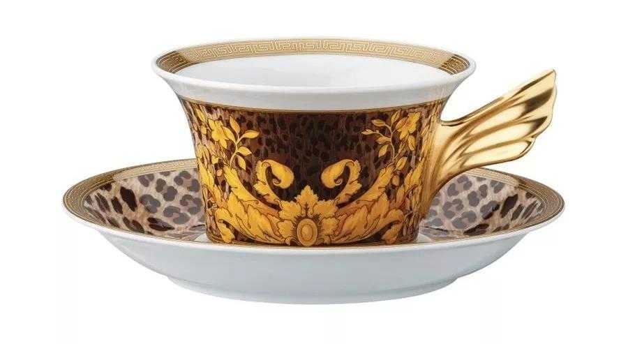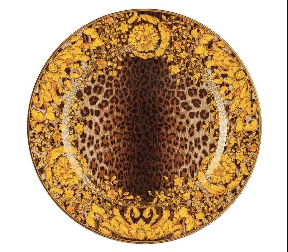 Gianni Versace在1980年代创立品牌时就为经典的巴洛克风格带来新生。他将传统图案转化为流行波普艺术设计,将意式壁画里的守护神和天使换做了金链条、美杜莎头像和豹纹皮革。Wild Floralia系列正是将这种炫丽的豹纹图案与金色的巴洛克花纹结合而展现出大胆创新的瓷器设计。