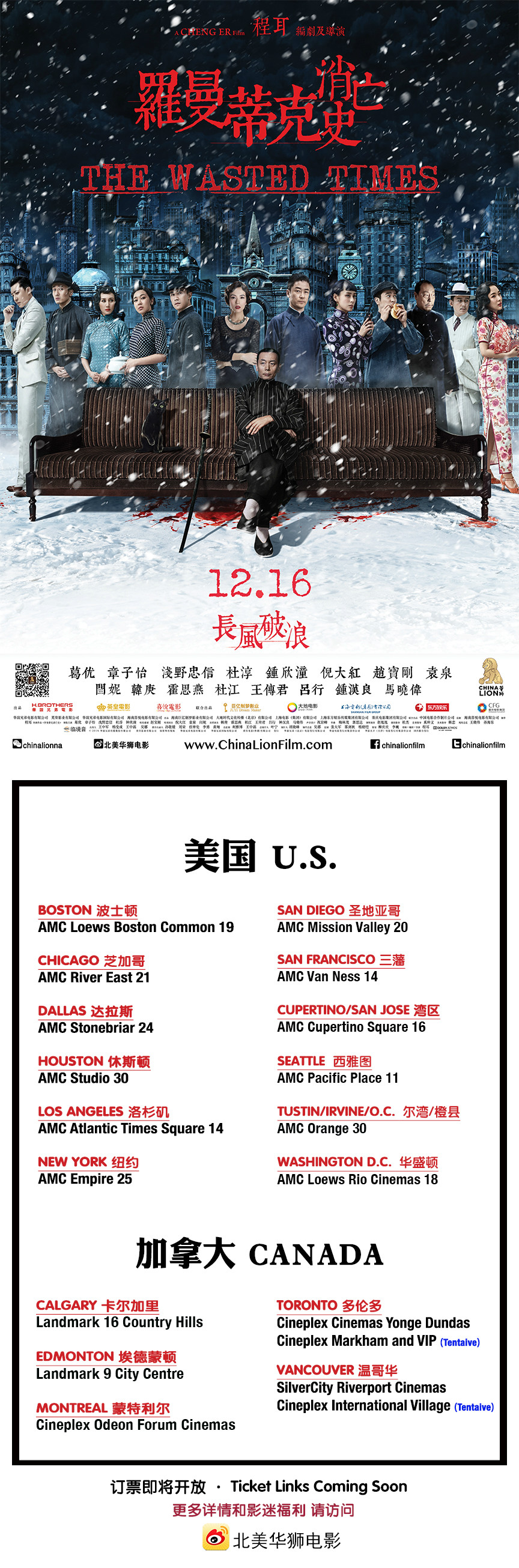 12月16日,北美迎来一部阵容强大,质量上乘,甚至敢于和《长城》正面杠的精彩电影——由程耳导演,葛优,章子怡,浅野忠信,杜淳 ,钟欣潼,倪大红 ,赵宝刚,袁泉,闫妮,韩庚,霍思燕,杜江,王传君,钟汉良等主演的《罗曼蒂克消亡史》。