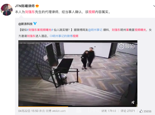 这段视频全程简体中文字幕,一位自称刘强东代理律师的@JTN陈曦律师表示,“经当事人确认,该视频内容属实。”