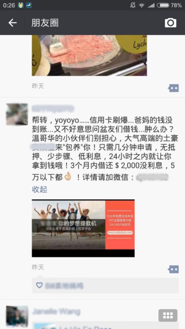 一个在温哥华朋友圈走红的私人贷款公司在各学生群中是这样宣传的:“信用卡刷爆,爸妈的钱没有到账,又不好意思向朋友借钱,怎么办?温哥华的小朋友别担心,大气高端的土豪来包养你!只要几分钟申请,无抵押、少步骤、低利息,24小时之内就让你拿到钱…”