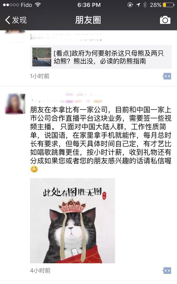 2016年了好么!变相拉皮条招聘广告早就过时了,中国流行网络主播有没有?朋友圈广告是这么说的“朋友在本那比(Burnaby)有一家公司,目前和中国一家上市公司合作直播平台,需要签一些视频主播。只面对中国大陆人群,工作性质简单,说国语,在家拿手机就可以操作,按小时计薪,收到礼物还有分成…” 大家都知道天朝正在肃清网络直播,女主播被勒令穿上衣服,这群人顺势转战温哥华。或许有人说这指不定是正当的主播工作呢?