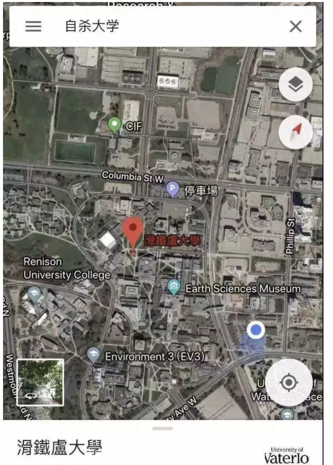 据说,如果你在谷歌地图中输入“自杀大学”,它就会出现滑铁卢大学的导航。