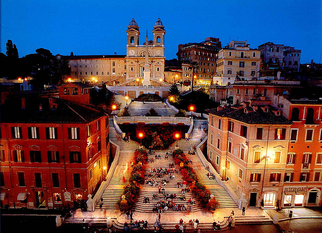 西班牙广场的阶梯是巴洛克大师贝尼尼的杰作。圣三位一体教堂居高临下地俯视着台阶上的芸芸众生,台阶下就是破船喷泉,这座喷泉是贝尼尼的父亲彼得罗-贝尼尼的作品。
