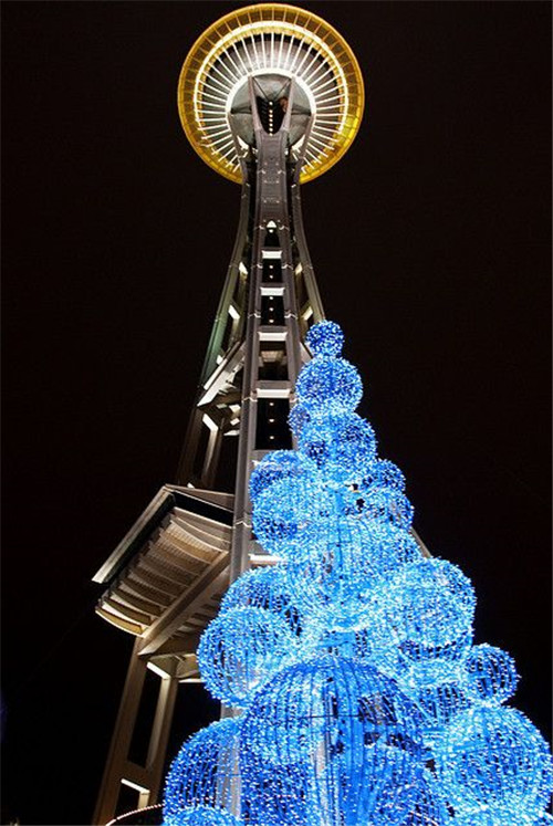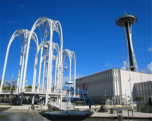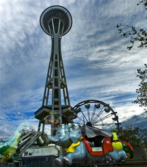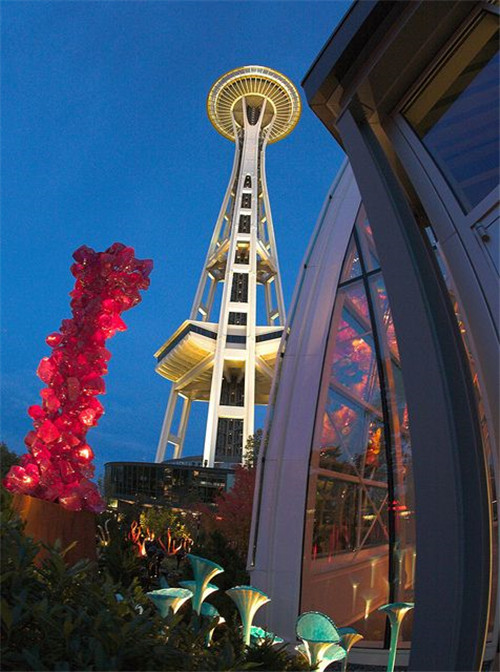 来到Seattle Center,最不能错过的当然就是现在西雅图的地标之一太空针塔了。太空针塔的高度是605英尺,在距离地面520英尺处是观景台和旋转曙U。搭乘透明电梯从地面到观景台只需40秒钟,登上观景台可以俯瞰西雅图360度的全景。太空针塔是Western国际饭店总裁Edward E. Carson为当年博览会所设计的重点建筑,其奇特的造型就象是’一个飞碟立在细细长长的金属上面’,整体设计非常前卫,这正符合当时博览会迎向未来的主题。