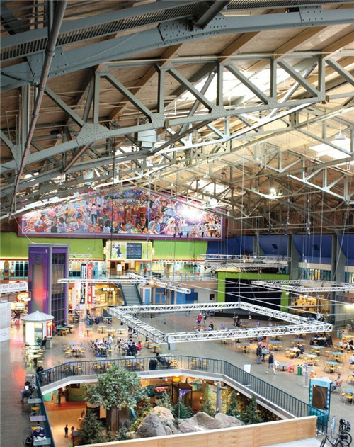 西雅图中心馆除了有上述的游乐场和儿童博物馆外,还有一个非常热闹的Food Court, 里面有咖啡店,是游玩途中休息的好地方。正值圣诞期间,大家都围绕在Food Court中间场地上的圣诞模型周围,看著模型里那些被白雪覆貌渐i爱的小屋,在轨道上来回行驶的小火车,圣诞树,小湖泊以及那些栩栩如生的小人儿。因为西雅图有不同民族的居民,馆内提供一个表演场地用于定期举办各国的文化庆典活动,如四月的日本文化节,七月的中国文化艺术节,十月的意大利节等等,其二楼顶部的巨大横幅壁画也体现出这里多元文化的特色。
