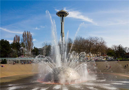 沿著西雅图中心里的大道一直往前走就看到了这个巨大的圆形喷泉,喷泉四周是绿茵茵的草地和长廊。喷泉随著播放的音乐节奏变幻著不同的喷水方式,当乐声激昂时冲天而起的水柱颇为壮观。蓝天白云下,坐在草地边的长椅上一边听著美妙的音乐,一边欣赏著喷泉精彩的水舞表演,真是很惬意的感觉。喷泉边总是聚集著不少爱玩水的大人小孩,常常当乐声突然转强时听到他们惊叫著跑开,周围正在欣赏喷泉的人都跟著不约而同地笑了。