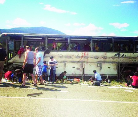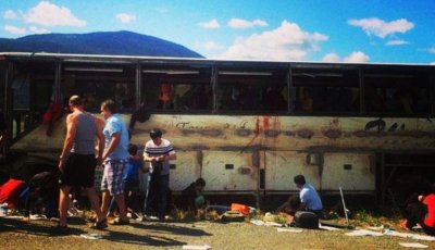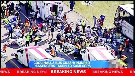 一辆载满华裔旅客的旅游巴士,昨日在大温哥华内陆梅里特市(Merritt)以南的高速公路上失事翻侧、滑行一段后再翻正停下;车上56人全部受伤,其中6人危殆,15人伤势严重,当局出动6部救护直升机、19辆救护车到场抢救。巴士上有来自中国、当地及美国的旅客,绝大部分是华人。有目击者称有伤者被压在巴士地下,现场到处有血,而翻侧滑行的左边巴士窗户全部爆裂,窗沿血迹斑斑。
