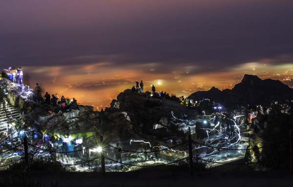 凌晨的泰山,漆黑一片的斗折山路上,闪烁着游客们随身携带的手电光亮。夜登泰山,只为一睹清晨的泰山日出与云海。